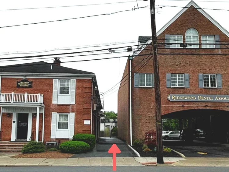 リッジウッドのオフィスはフランクリンアベニューStop &Shop前のビルディングにあります。駐車場は建物の裏になります。上の写真の赤い矢印が駐車場の入口です。